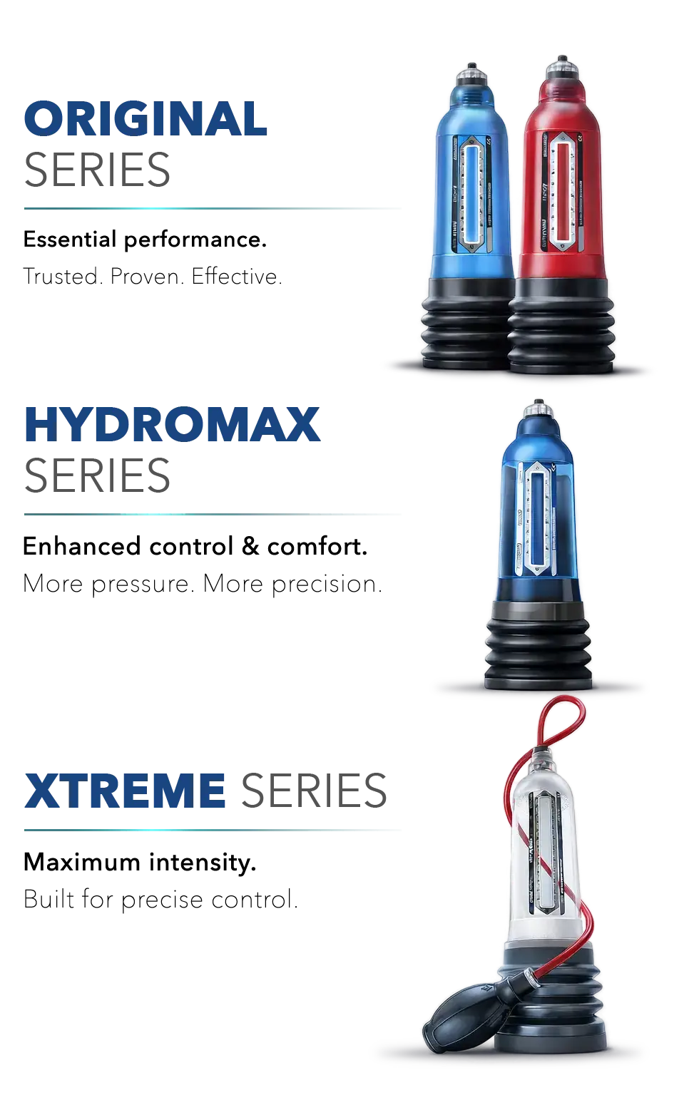 Con el tiempo, Bathmate evolucionó hasta convertirse en una gama completa de bombas de pene avanzadas, diseñadas para satisfacer diferentes objetivos y niveles de experiencia. Las mejoras continuas en el control de la presión, el sellado, la comodidad y la durabilidad dieron lugar a la serie Hydromax , que ofrece múltiples tamaños para garantizar un ajuste perfecto para cada usuario, con erecciones de entre 7,6 cm y 23 cm. Cada modelo se basa en tecnología hidroeléctrica probada para ofrecer resultados más rápidos y con mayor confianza.